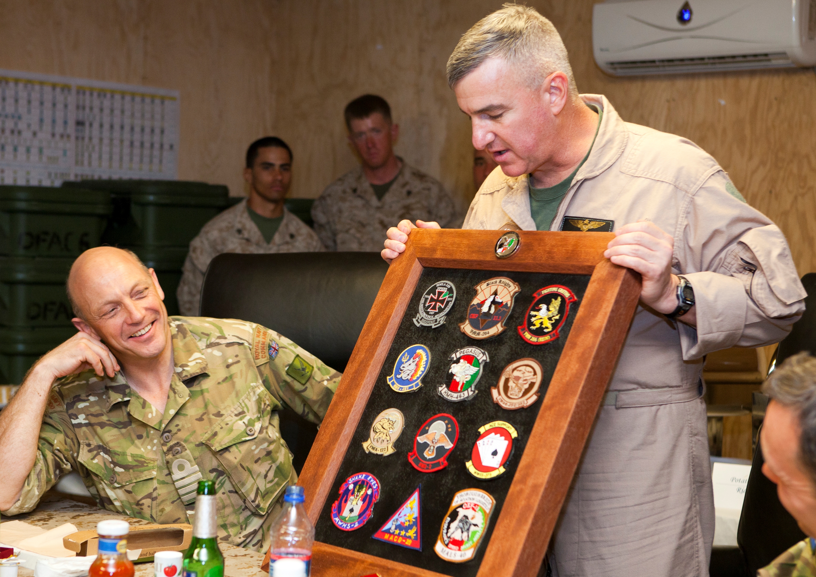 Brig. Gen. Glenn M. Walters presents Royal Navy Capt. Paul Shawcross with a display case featuring a collection of patches representing squadrons with 2nd Marine Aircraft Wing (Forward) during a farewell banquet in honor of Shawcross on Camp Leatherneck, Afghanistan, April 14. Shawcross, the former commander of the United Kingdom’s Joint Aviation Group passed his authority to British Army Air Corps Col. Peter Eadie, April 15. Walters is the commanding general of 2nd MAW (Fwd.)